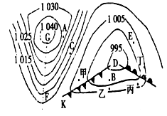 (1)根据等压线的形态和数值变化来判断。G处等压线呈闭合状态,中间高四周低为高压,D 处等压线呈闭合状态,中间低四周高为低压。