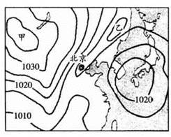 1.要计算气压差最大差值,关键是从图中找出气压值最高和最低处,可以充分利用等值线图的基本规律来找。很容易看出图中等压距为5百帕,甲处应为一个高压中心,气压值在1035--1040之间。然后根据等压线的分布规律,东侧太平洋中,日本九州岛处为一个高压中心,气压值为1020--1025,则离北京最近的等压线数值为1010,图中乙处为低压中心,气压值为1000--1005。则最大气压差值在甲乙两区域间产生,为1040-1000=40百帕,故C正确。