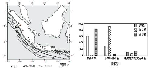 材料三:印尼是世界最大的群岛国家,人口约2.38亿,面积190万平方千米。图乙表示2007年印尼种植业中不同类型农作物产值、出口额以及进口额所占比重示意图。