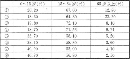 (1)由表中数据可知,①②③④65岁以上人口超过7%,进入老龄化,是发达国家。③和④两国社会负担最轻是正确的;⑤⑥⑦⑧0-15岁人口比重较大,说明新增人口较多,自然增长率比较高,是发展中国家。所以D选项是错误的。而⑧国是发展中国家,人口的人均寿命可能是最短的,是正确的。