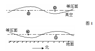 5、单选题 读北半球某地区热力环流产生的气压场分布图8,图中实线为等压面,虚线为等高面,完成问题。