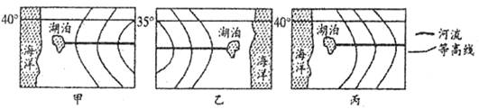 【小题1】根据河流往往形成在山谷中,山谷的等高线向高处凸出,河流往低处流的特点,得到甲图中的河流以湖泊为源地,自西向东流,自西向东流的河流北岸侵蚀严重,说明地转偏向力向左偏,该地位于南半球,该是位于40° www.91eXam.orgS以南的大陆西岸地区,应该属于温带海洋性气候;同理得到乙图中的河流从东往西流,该地河流北岸侵蚀严重,说明乙图所示地区位于北半球,乙图位于35°N以南的大陆东岸地区,属于亚热带季风性气候;同理得到丙图中的河流自东向西流入湖泊,河流北岸侵蚀严重,说明地转偏向力向右偏,该地位于40°N以南的大陆西岸地区,属于地中海气候。因此本题正确答案为D。