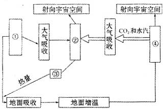 (填数字)能力的增强,并通过 (填数字)把热量还给地面,从而使全球气温变暖的趋势加快。(4分)