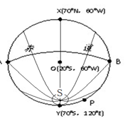4、单选题 图中圆圈AXBPYA为地球大圆(圆半径等于地球半径),弧AB为赤道,括号中的数据为X、O、Y三地的地理坐标。完成题。