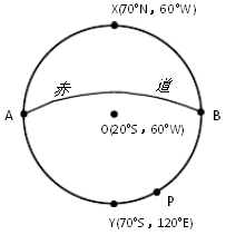 4、单选题 图中圆圈AXBPYA为地球大圆(圆半径等于地球半径),弧AB为赤道,括号中的数据为X、O、Y三地的地理坐标。完成题。