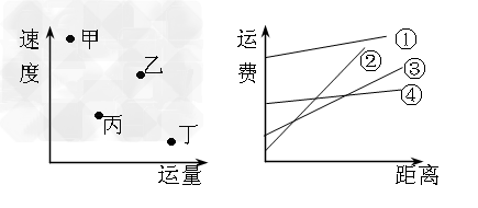 3、单选题 下面两图是四种运输方式(铁路、公路、水运、航空)特点对比图,符合图中省区西部地区最主要运输方式特点的组合是