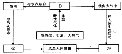 (1)填充下图相应数码框中的内容,显示燃烧化石能源对人体危害过程,以反映开发新能源的必要性。
