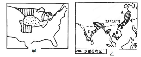 (1)甲图表示美国中部的小麦带和玉米带,属于商品谷物农业;主要的农产品为小麦和玉米;