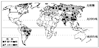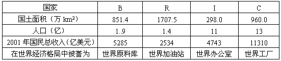 3、综合题 下图中B、R、I、C四个国家被称为“金砖四国(BRIC)”。根据资料,结合所学知识,回答问题。