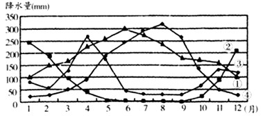 1、下图中①②③④四条降水量的月份变化曲线,与图中甲地相符的是