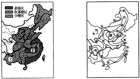 5、综合题 读我国部分地区雨涝分布图和我国部分地区干旱总次数等值线图,结合所学知识回答下列问题。