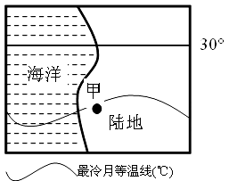 【小题1】冬季,同纬度的陆地气温低于海洋气温,等温线向低纬方向弯曲,A错误;根据图示,陆地等温线凸向北方,说明越向北纬度越低,图示地区位于南半球,B错误;南半球7月份温度低,C错误;甲地在30°S-40°S之间的大陆西岸,可能为地中海气候,D正确。