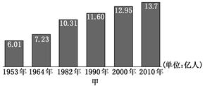 (1)从甲图可以看出50多年来我国人口增长速度的特点为(3分) ( )