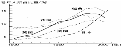 小题1:老年人口的比重是衡量老龄化的直接标准,根据图示1900年的数据,法国和瑞典的老年人口比重最高,已成为老龄化国家。