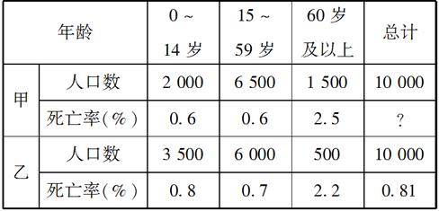 小题1:根据人口死亡率=死亡的人口总数/总人口×100%的公式,可以计算出甲组的人口死亡率是(2 000×0.6%+6 500×0.6%+1 500×2.5%)/10 000×100%=0.885%。