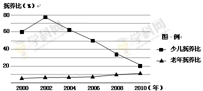 4、单选题 抚养比是指人口中非劳动年龄人口数与劳动年龄人口数之比。当总抚养比≤50%时称为人口红利期。下图为我国沿海某省2000~2010年抚养比变化图。读图完成下列各题。
