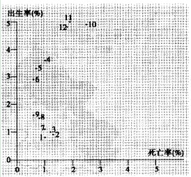 2、单选题 读“不同国家出生率、死亡率统计圈”,图中1~12代表国家。回答1—3题。