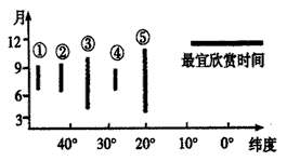 4、单选题 读我国山水风景区最宜欣赏时间与纬度关系图,回答(1)——(2)题。