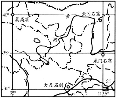 5、综合题 石窟艺术在我国已有数千年的历史。人们在山崖上开凿洞穴,并进行绘画和雕塑,以表达对宗教的虔诚。下图为"我国著名石窟分布图",读图完成下列问题。