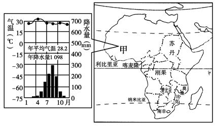 5、单选题 地处非洲的甲国(如图)希望与中国展开合作,以缓解其粮食供应紧张问题,结合非洲略图及相关气候资料图,回答38—40题。