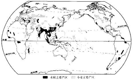 1、综合题 (7分)读“世界水稻、小麦主要产区”分布图,回答下列问题。