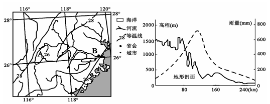 小题2:右上图大致为甲图从A至B一线附近地形剖面图,图中虚线表示当地一次特大暴雨量分布状况,据图判断最大暴雨量分布的地区海拔高度约为多少米?
