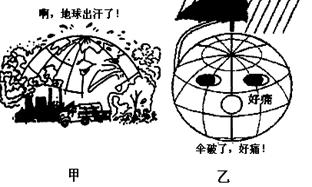 (1)图中甲乙分别反映的环境问题按照环境问题的性质分类,它们都属于?类型的环境问题(1分)