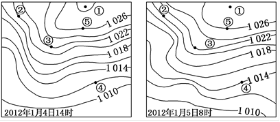 5、单选题 下图示意北半球某区域2012年1月4日14时和5日8时海平面气压(单位:百帕)分布图。读图完成下列问题。