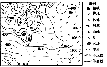 (1)此时,A城镇风向是________________。A与D相比,晴天概率大的是____,原因是______________