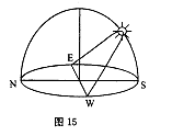 3、综合题 图15为某地二分二至四个节气中某天的太阳视运动轨迹,该日日出日落北京时间分别为5:28和17:28,该日最大太阳高度为44°,若该地一年中昼最长为15小时40分,读图完成下列各题。(12分)