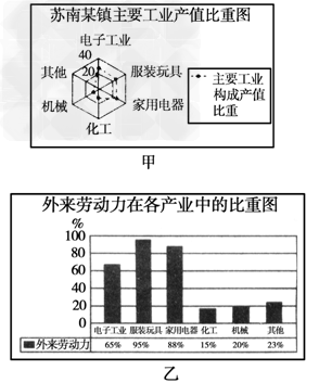 5、综合题 图甲与图乙分别反映苏南某城镇主要工业产值比重构成和外来劳动力数量的分布,读图并回答下列问题。