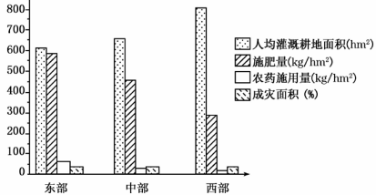 小题2:从图中看出,东部地区施肥量和农药施用量都最大,由此造成的农业环境污染比中西部严重;但东部生态环境比西部要好,主要是由于东西部气候不同而导致植被等差别很大。成灾面积的百分比相差不大,但由于灌溉总面积东部大于西部,故东、西部成灾面积相差应很大。东部地区种植历史悠久,土地已得到充分开发,故后继潜力应不会太大。