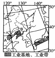 小题1:B为我国的辽中南工业基地,发展的主要社会经济区位因素是临近铁煤,资源丰富;海陆联运,交通便利;人口稠密,劳力丰富。临江靠海,水源充足是长江三角洲工业基地的优势。