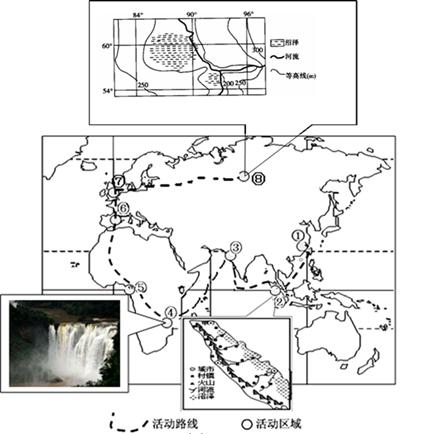 第(2)题,由材料可知:④地位于瀑布附近,倾注的河水产生一股充满飞沫的上升气流,使这里降水丰沛;从热量上来分析,该地纬度低,气温高,因此该地形成了“雨林”景观。