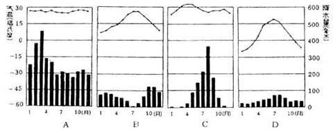 本题解析:根据四图的气温、降水量分布信息判断,A图示终年高温多雨,故判断为热带雨林气候;B图示最低月温在0°C以上,雨热不同期,故判断为地中海气候;C图示终年高温,且降水量集中于夏季,故判断为热带草原气候;D图示最低月温在0°C以下,终年少雨,故判断为温带大陆性气候。