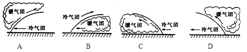 1、单选题  下列四副图中,正确表示冷锋天气的是(   )