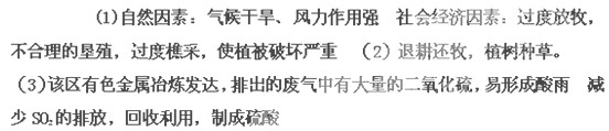(1)A地在我国的西北干旱半干旱地区,荒漠化的原因包括自然原因:气候干旱是基本条件,大风频繁是动力条件,地表物质疏松,植被覆盖率低,缺乏植被保护是物质基础。人为原因是:人类不合理的生产活动:过度樵采、过度放牧、过度开垦、水资源利用不当。