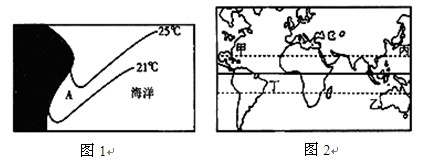 2.A洋流为南半球中低纬度大陆东岸的暖流,因此A洋流可能出现在图2中丁处。