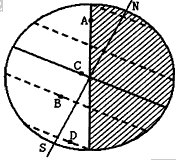 3、综合题 下图表示某时刻全球昼夜分布状况,阴影为夜半球。读图回答问题。