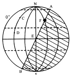 4、单选题 读下图,AB为晨昏线,CD为任意经线。AB与CD所成的夹角α,最大值可能是