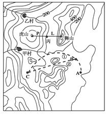 (2)海拔高度在200~400米之间:图中等高距可推算出为200米,而甲乙两村均位于200米及其递增的相邻等高线之间及200~400米之间;山谷出口处,有河流流过跨河分布:山谷线凸向高处,山谷往往易发育河流,甲乙两村均被等高线向高处凸的山谷线穿过,且位于山谷出口处。