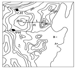 【小题1】泥石流形成于山谷中,根据图示的等高线分布,B处等高线“凸高为低”,判断为山谷,故可能最容易发生泥石流灾害。