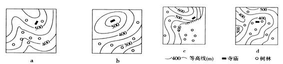 2、单选题 下图是四幅等高线地形示意图,能体现“深山藏古寺”意境的是( )