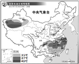 4、单选题 下图为2013年7月29日中国高温区域预报图。读图,回答题。