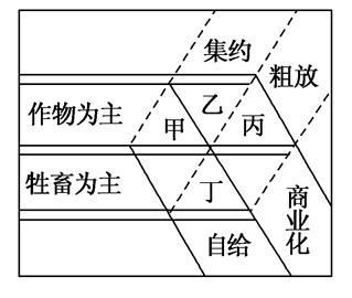4、单选题 下图甲~丁表示四种农业地域类型的经营特色,其中表示季风水田农业的是( )