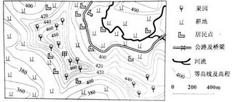 (1)主要考查读图能力,根据等高线判读地形类型是丘陵。?甲地地形是鞍部。