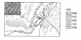 1、单选题 右图是我国西部某地区略图,图中左上方所示为当地铁路沿线的草方格沙障。读图回答问题。
