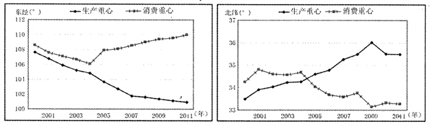 小题1:根据两者重心的经纬度变化来分析,生产重心总体上往西往北移,但有波动;消费重心往东南移;总体上供需重心相距渐远,图中两曲线的差距越来越大。故选D。