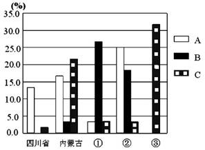 小题1:根据四川省和内蒙古的三种能源占全国的比重判断,A为天然气;B为石油;C为煤炭,故判断①为黑龙江;②为新疆;③为山西省,黑龙江为我国最大的木材输出省区,故B项正确。