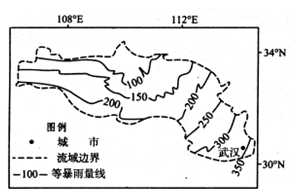 (1)读图,根据图中等值线分布情况分析,可以看到,东部等暴雨量线数值从东南向西北递减,西部从南向北递减。也可以说成“大致从东南向西北递减”。汉江位于秦岭山地南面,山区在暴雨多发季节,容易引发滑坡、泥石流、崩塌等地质灾害。